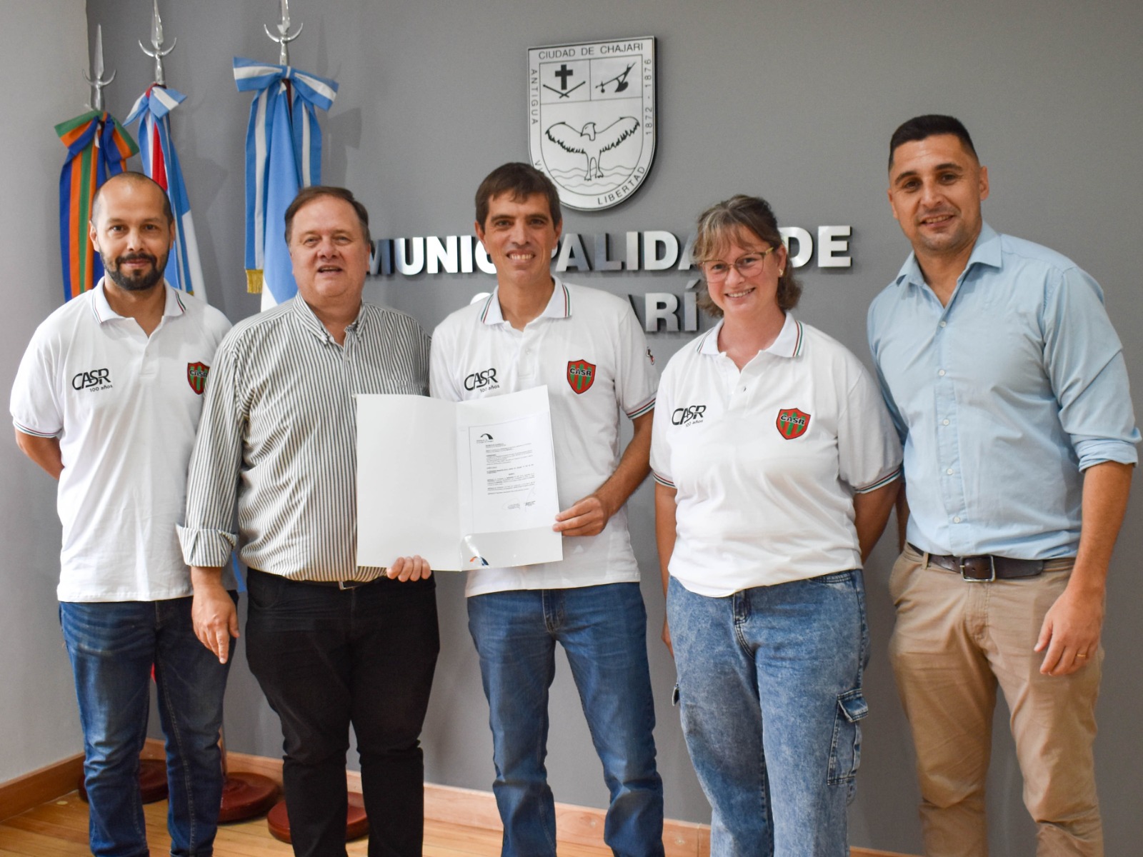 Dicho aporte económico consiste en un subsidio no reintegrable por 20 millones de pesos que el Gobierno de la ciudad de Chajarí destina al club Atlético Santa Rosa, en el año en el que dicha institución está celebrando su centenario. El encuentro tuvo lugar en el despacho del Intendente Borghesan, donde también estuvieron presentes el Director de Deportes y Recreación Ramiro Galeano, la Secretaria de la Comisión Directiva del club Fernanda Velazco y el Tesorero Javier Zapata. Allí dialogaron sobre el programa de actividades que se viene realizando desde el club para celebrar sus 100 años, los cuales se conmemorarán el 23 de julio próximo y se hizo entrega de una copia del Decreto y Ordenanza que formaliza el aporte, que ya fue transferido a la entidad.